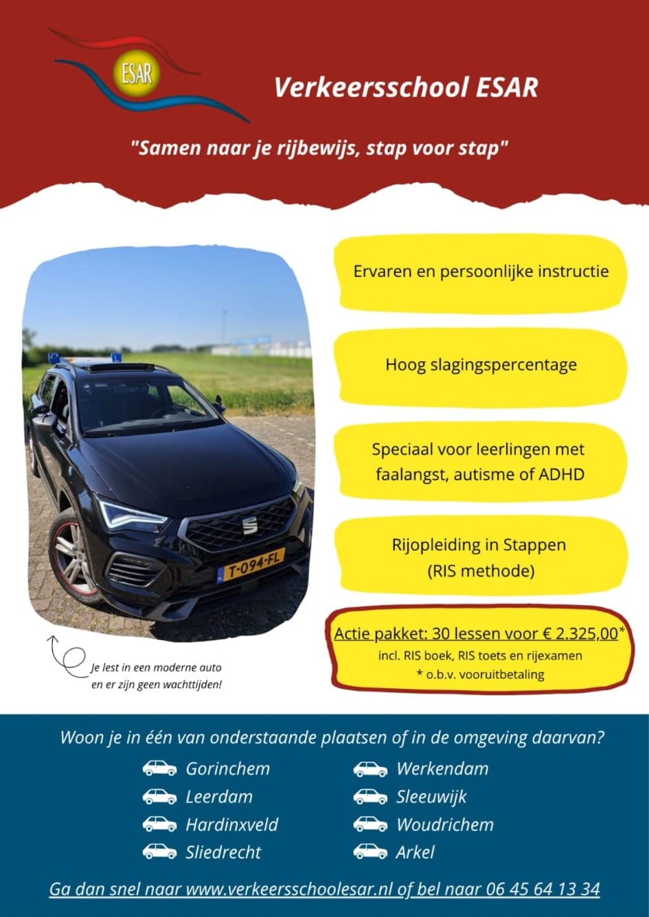 Rijschool ESAR maakt gebruik van de moderne opleiding RIS (Rijopleiding in Stappen). De rijlessen gaan steeds een stap verder. Er wordt begonnen met alleen sturen, dan ook remmen en zo wordt stap voor stap de basis gevormd. Onderzoeksresultaten hebben aangetoond dat leerlingen veiliger het verkeer in gaan na het volgen van deze opleiding. Bovendien is het slagingspercentage 20% hoger! (volgens het CBR)